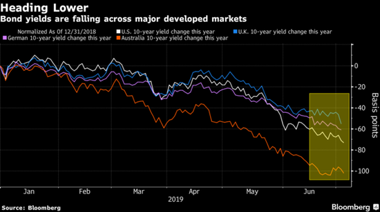 此外,美债当前也升势如虹。美国10年期公债收益率则已触及逾两年半最低。周三稍早触及1.939%,为2016年11月以来最低,而在其走弱的同时,10年期德债收益率也触及负0.399%的纪录低点。